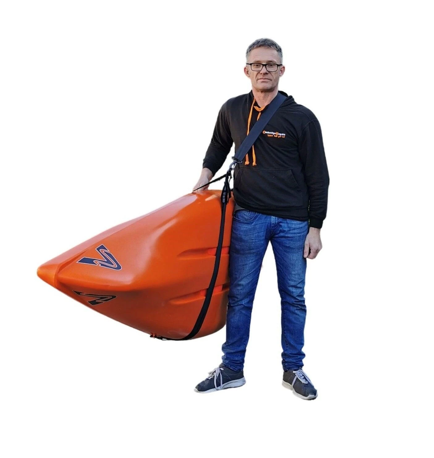A simple and easy way to carry your kayak – suitable for single kayaks upto 25kg – Adjustable size – Padded shoulder strap – Alternative to kayak trolley – Space-saving