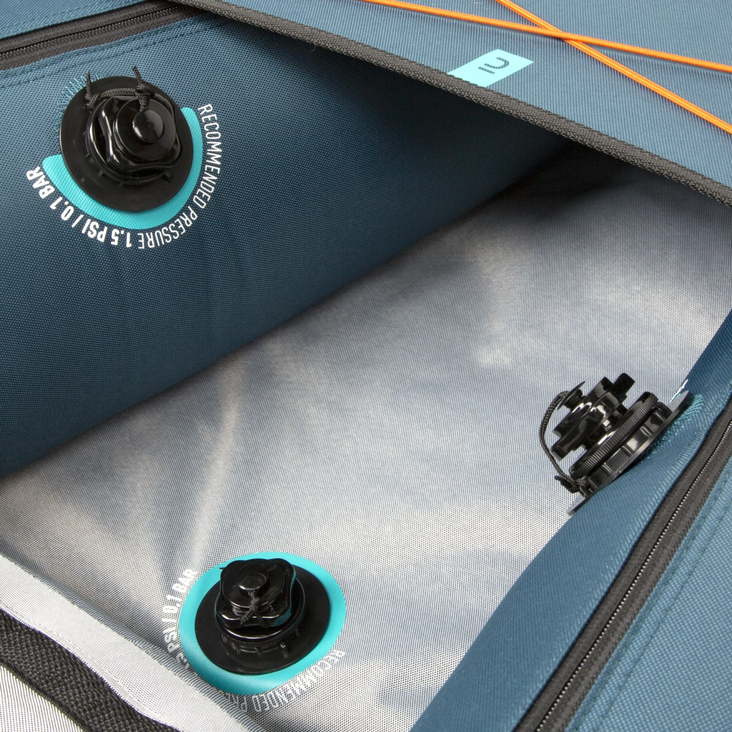 Inflate the floor, then one of the side tubes, then the second one to 50%. Check the overall positioning of the chambers. Then fully inflate it without exceeding 0.1 bar (1.5 psi).