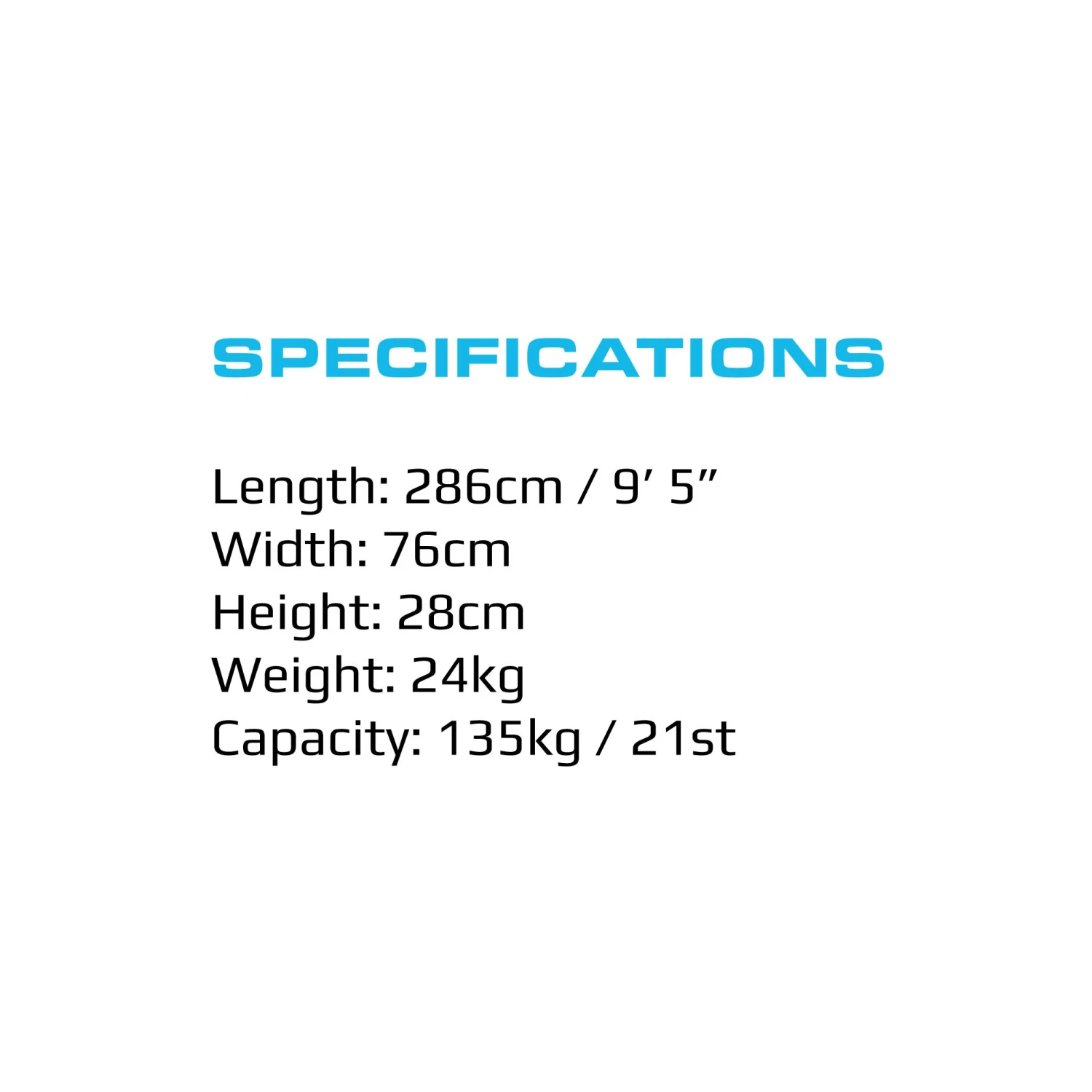 Dimensions Length: 286cm Width: 76cm Height: 28cm Weight: 24kg Capacity: 125kg